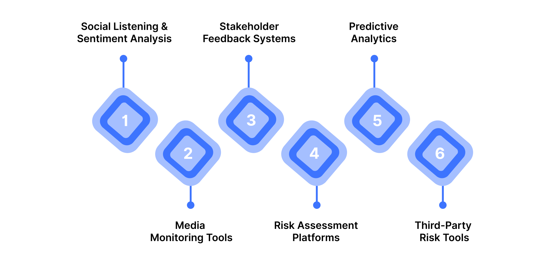 Companies rely on social listening platforms, media monitoring tools, predictive analytics, and enterprise risk management platforms to track and respond to reputational threats.