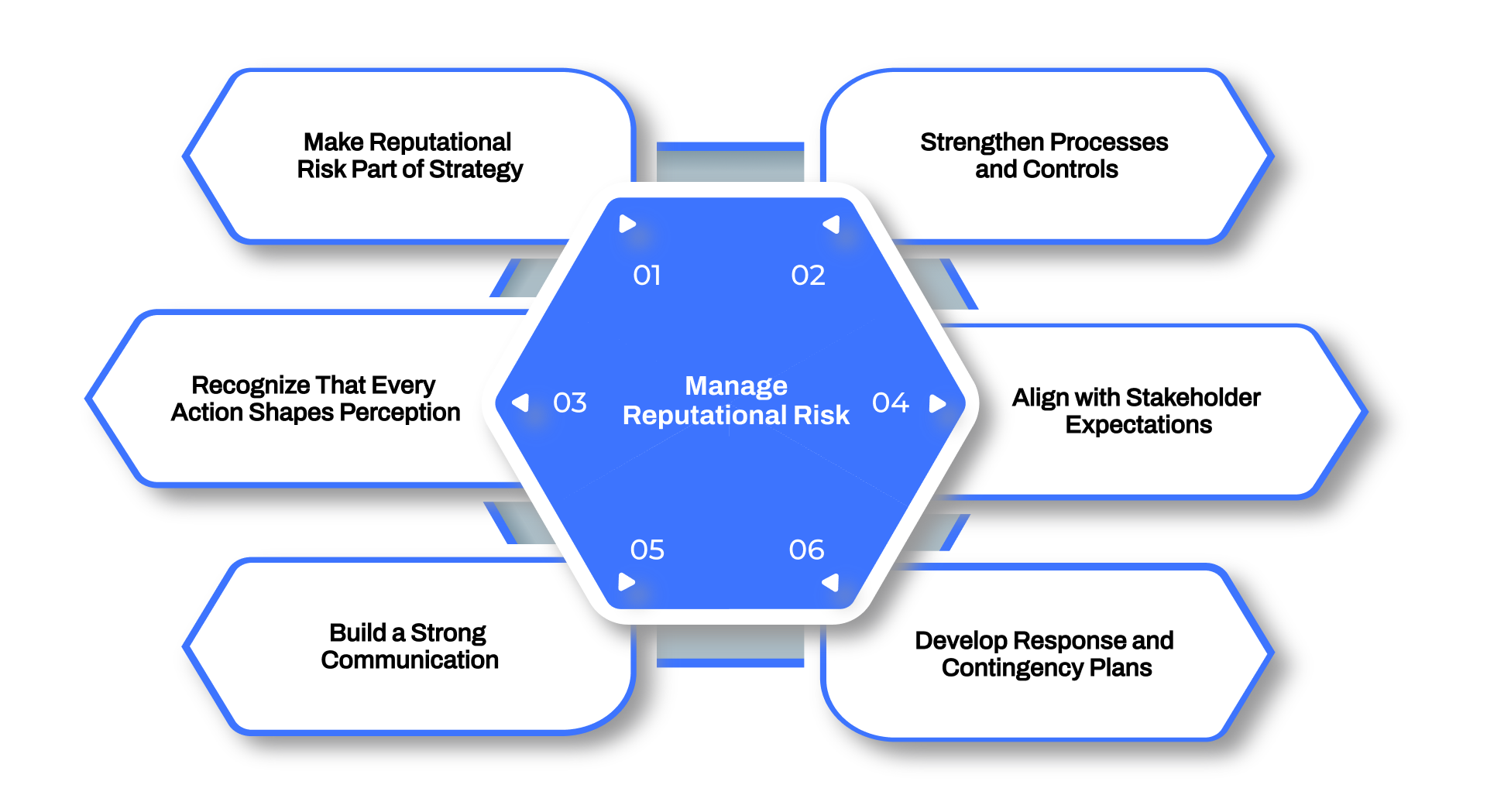 Managing reputational risk is not about crisis control alone, it’s about building resilience into the DNA of your organization. By embedding it into enterprise risk assessments, leaders can proactively address vulnerabilities before they spiral into public crises. Here are six effective strategies: