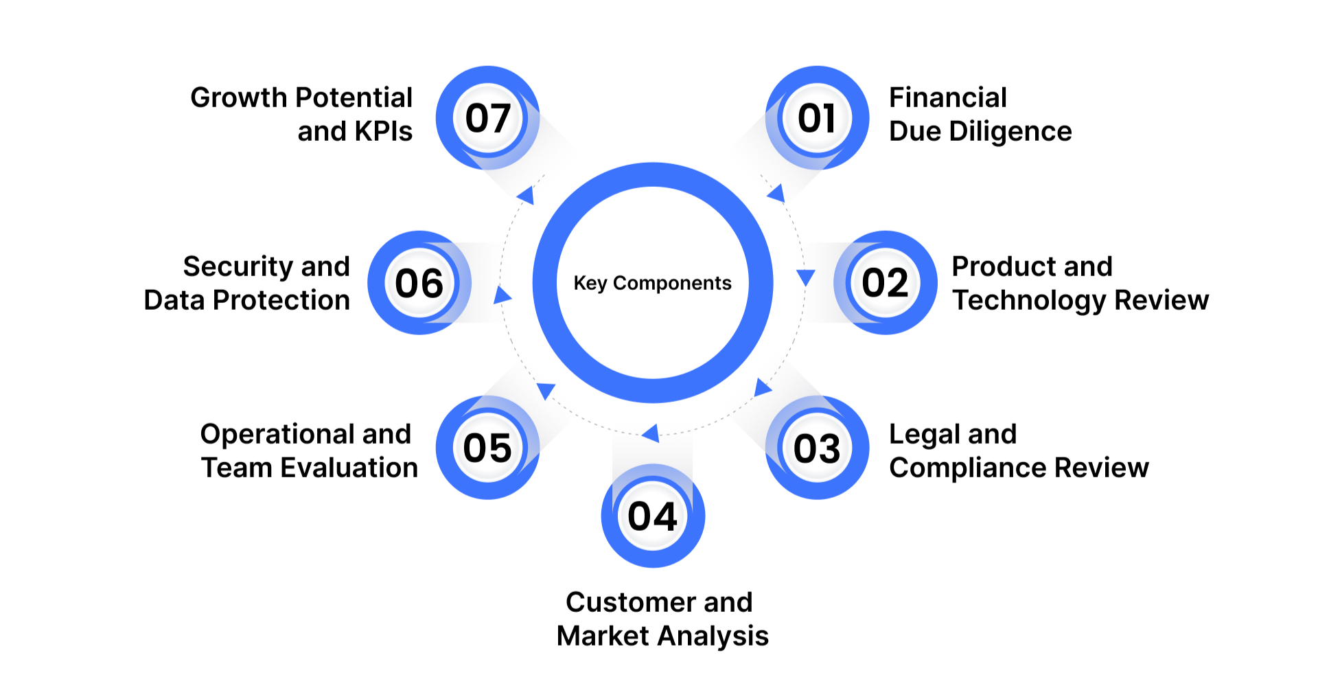 A thorough SaaS due diligence checklist ensures that both buyers and sellers gain a complete understanding of the company’s financial, operational, and technical health before a transaction takes place. It helps identify potential risks, verify claims, and build transparency throughout the acquisition process. Below are the core components every SaaS due diligence checklist should include: