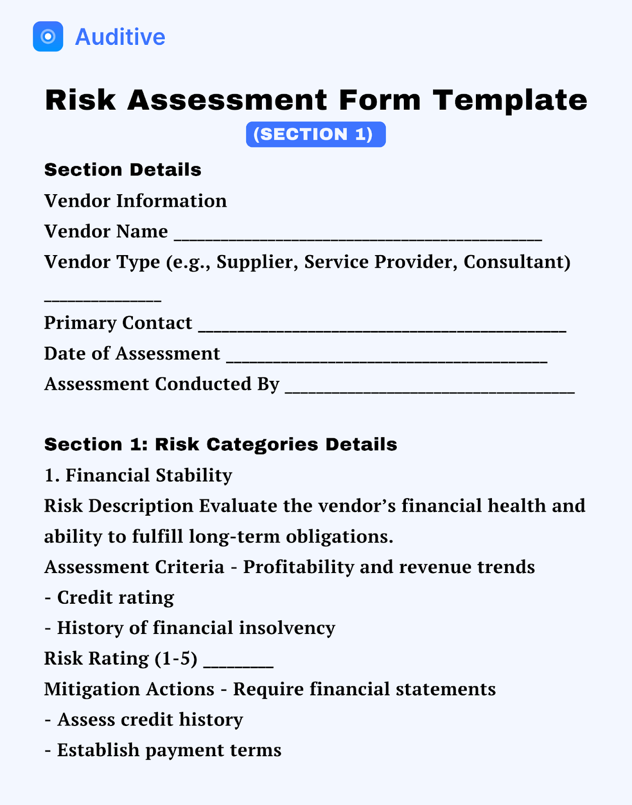 A risk assessment form helps systematically record and rate each vendor against predefined risk factors. Elements often include the following: