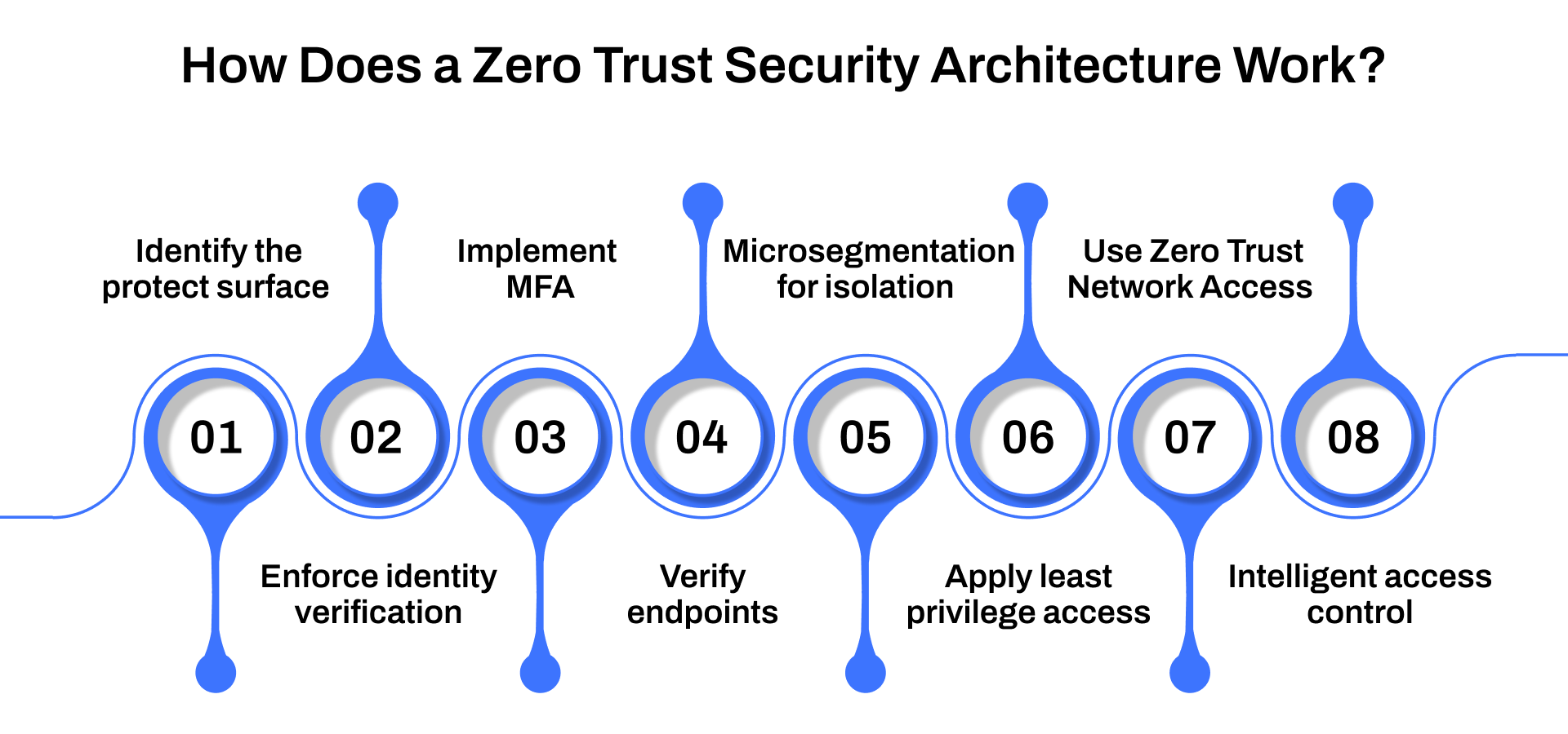 As we discussed above, the Zero Trust Security architecture is built on a simple principle: never trust, always verify. Instead of assuming that everything inside the network is safe, it treats every user, device, and application as potentially untrusted until proven otherwise. Here’s how this model functions in practice: